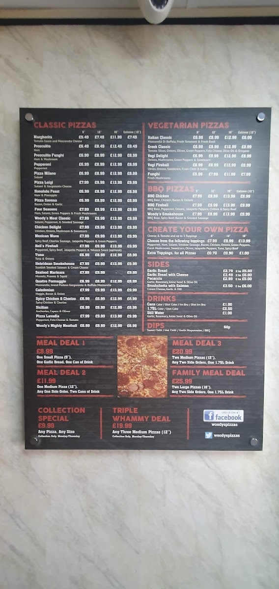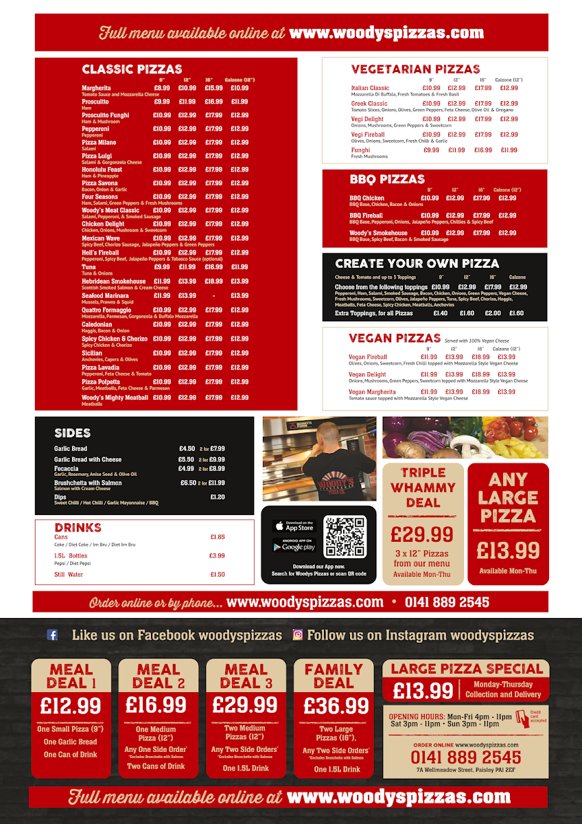 Introducing the menu at Woody's Pizzas Paisley, nestled in the heart of Paisley, is an exciting culinary experience. Their lineup boasts a diverse range of pizzas that cater to every palate. From classic favorites like the Margherita and Pizza Luigi to adventurous options such as Hell's Fireball, there's something for everyone. Vegetarians can indulge in the delightful Vegi Fireball and the Italian Classic, while BBQ lovers can enjoy the Woody's Smokehouse.